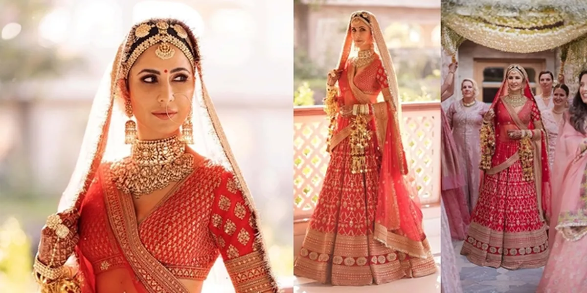 Katrina Kaif tampil memesona pada hari pernikahannya dengan Vicky Kaushal. Ia mengenakan lehenga karya desainer Sabyasachi Mukherjee bernuansa merah dengan hiasan benang emas.