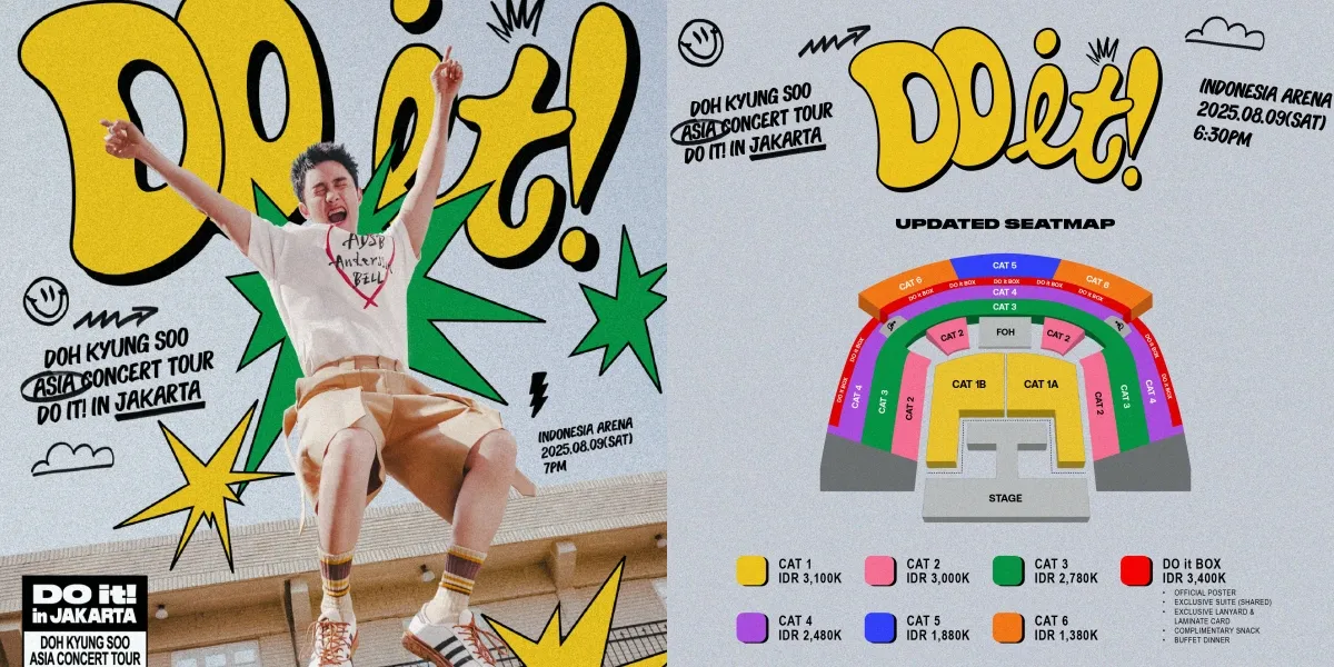 Doh Kyung Soo Fans dapat menantikan daftar lagu-lagu solonya, serta penampilan spesialnya sebagai penyanyi dan performer yang serba bisa. Tiket untuk 2025 DOH KYUNG SOO ASIA CONCERT TOUR <do it in jakarta> akan mulai dijual pada 9 Juni 2025 pukul 14:00 WIB melalui situs resmi www.doinjakarta2025.com, dan akan tersedia dalam berbagai kategori tempat duduk: