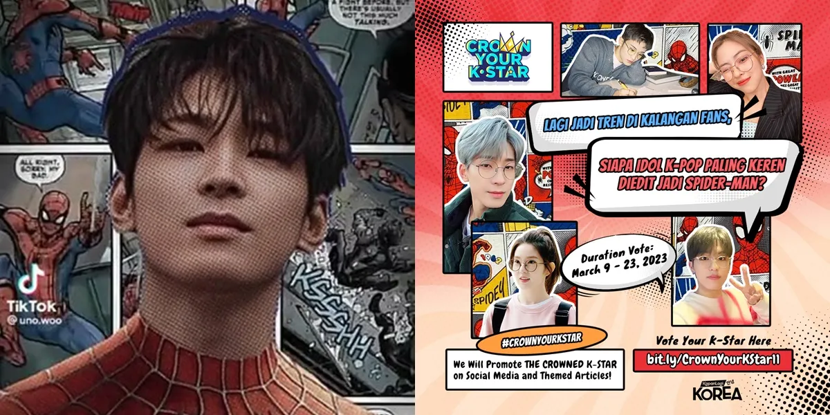 Kapanlagi.com - Ada yang viral lagi nih di kalangan K-Popers. Baru-baru ini muncul tren di mana para penggemar mengedit foto idola mereka menjadi Spider-Man. Tema itu juga yang kemudian diusung dalam Crown Your K-Star Kapanlagi kali ini yaitu 'Lagi Tren di Kalangan Fans, Siapa Idol K-Pop Paling Keren Diedit Jadi Spider-Man?'