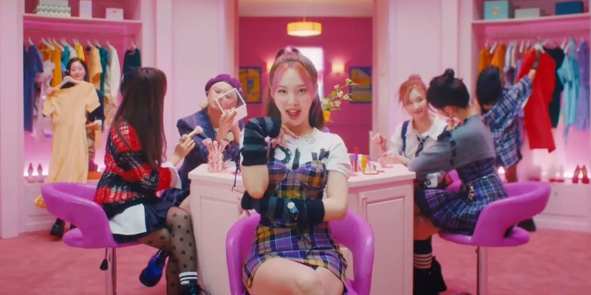 Barbie Sana TWICE tak henti-hentinya membuat jantung penggemar berdebar. Masih bermotif kotak-kotak, Sana TWICE menggunakan plaid mini skirt dengan warna merah hitam. Pada bagian atas pakaian, Sana TWICE memberikan vibes high school banget dengan kemeja crop lengan panjang berwarna putih dengan rompi berwarna navy blue.