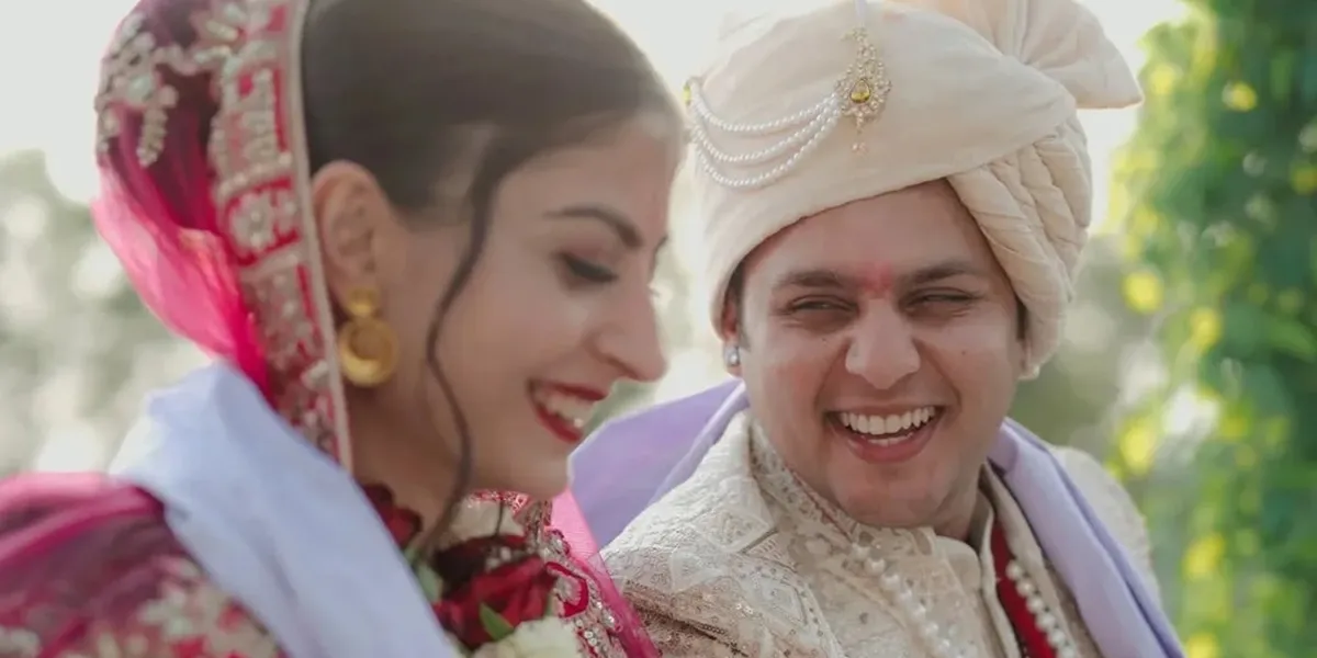 Aarti tampak anggun mengenakan lehenga merah dengan bordiran emas, dipadukan dengan perhiasan emas dan mutiara. Di sisi lain, Dev memilih sherwani krem dengan bordiran detail dan selendang, lengkap dengan turban tradisional yang menambah kesan megah pada penampilannya.
