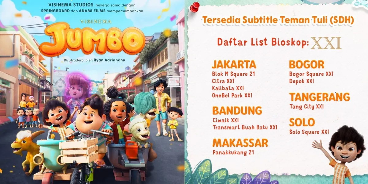 Kapanlagi.com - Film animasi Indonesia terlaris sepanjang masa, JUMBO, berhasil membuat para penggemar terharu atas visi yang dimiliki dan ditekuni. Tayangan hasil penyutradaraan Ryan Adriandhy itu dikabarkan telah menghadirkan edisi yang menggunakan subtitle khusus teman tuli (SDH) di beberapa bioskop Indonesia. Hal ini menunjukkan bahwa JUMBO sangat berdedikasi dalam mengedepankan rasa inklusif bagi seluruh kalangan penonton.
