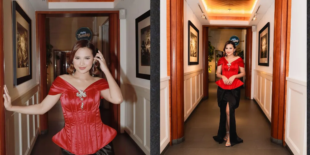 Tak hanya itu, Indah juga mengenakan rok hitam panjang dengan belahan tinggi yang menciptakan nuansa glamor. Perpaduan warna merah dan hitam ini memberi kesan klasik namun tetap modern.