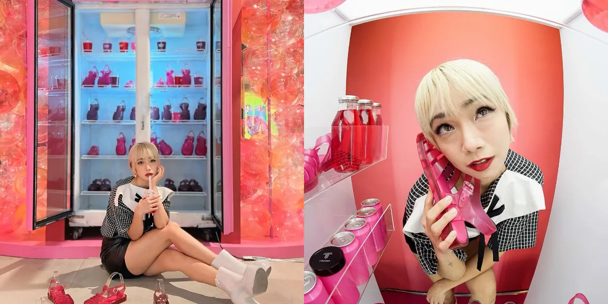 Selain rambut dan riasan wajahnya yang mencolok, konsep pemotretan yang ia pilih juga tidak kalah menarik. Intan Ayu terlihat berpose di depan lemari pendingin yang dipenuhi sandal jelly berwarna pink. Warna-warna cerah dan elemen playful yang ditampilkan dalam foto ini memberikan kesan segar dan eksperimental, sesuai dengan karakter khasnya yang kreatif.