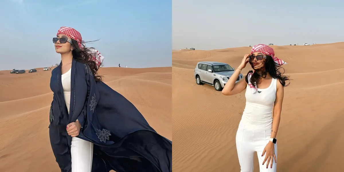 Dalam foto-foto yang diunggah, Mayang Lucyana terlihat berpose anggun di hamparan pasir luas, lengkap dengan kendaraan off-road khas petualangan gurun di belakangnya. Tak hanya itu, aksesori yang dikenakan seperti kacamata hitam dan sorban merah putih semakin menambah kesan mewah pada potretnya.