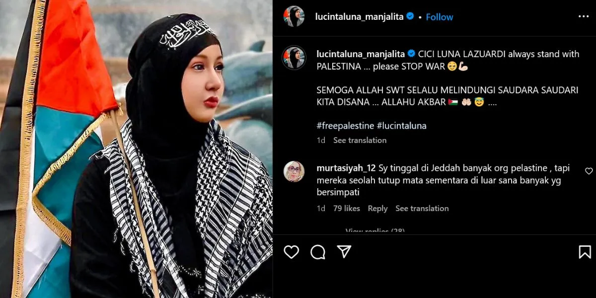 Bersamaan dengan caption yang berisi dukungan kepada Palestina, Lucinta mengunggah sebuah foto editan dirinya yang memakai hijab beserta bendera Palestina dibelakangnya.