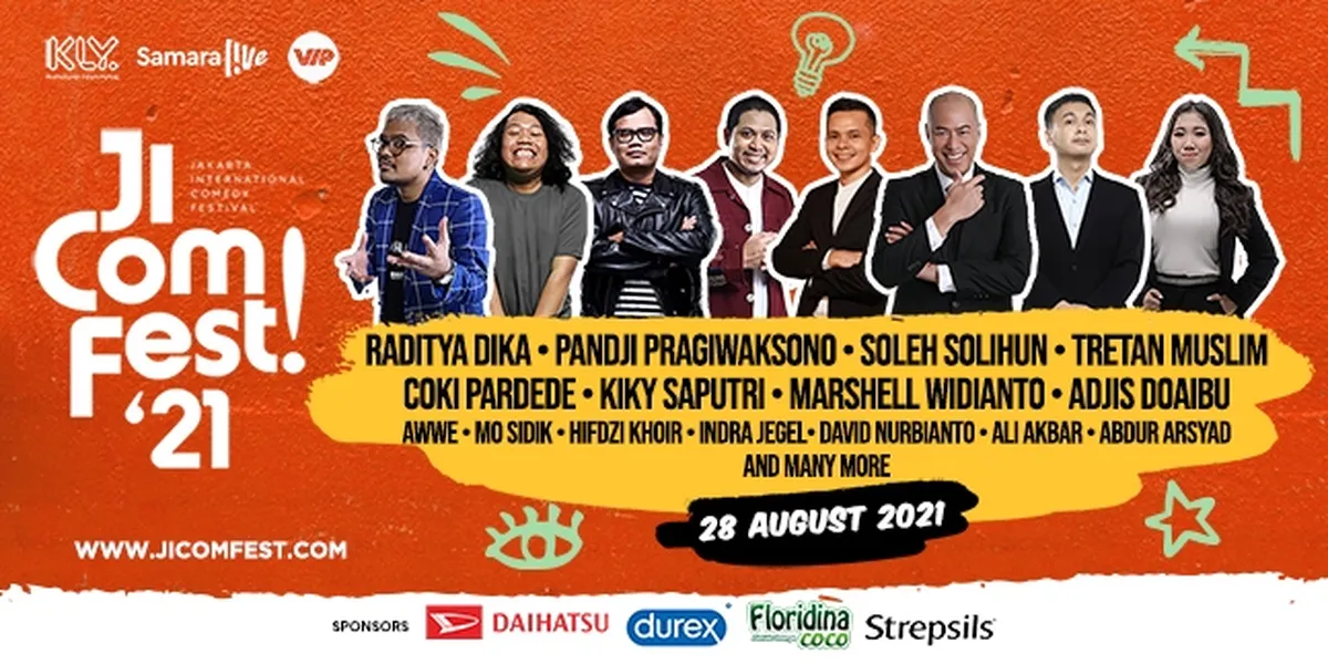 Kapanlagi.com - Festival komedi pertama dan terbesar di Indonesia kembali lagi, Jicomfest 2021 yang di sponsori oleh Daihatsu, Durex, Floridina dan Stepsils akan dihadirkan secara virtual selama 10 jam nonstop di Vidio.com pada Sabtu 28 Agustus 2021 mendatang.