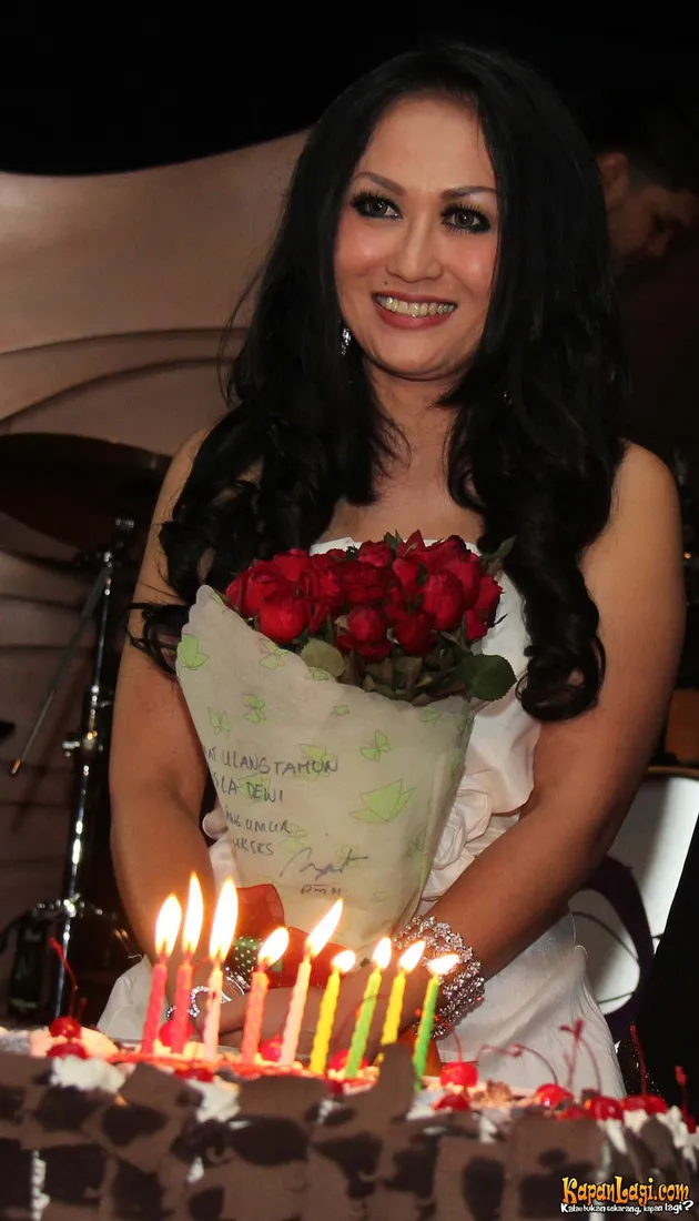 Senyum ter... lebar dikembangkan oleh Sisca Dewi di hari ulang tahunnya yang ke 33. Bunga yang ia pegang itu dari Roy Marten loh!