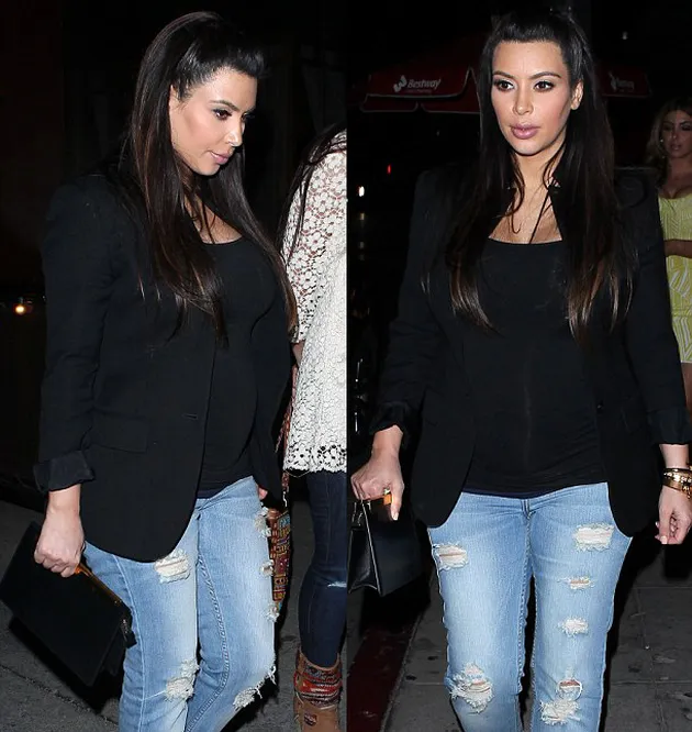 Sering terlihat dengan gaun-gaun yang cantik, kali ini Kim Kardashian tampil dengan memakai celana jeans belel. Namun karena dasarnya cantik, walau belel tetap terlihat bagus.