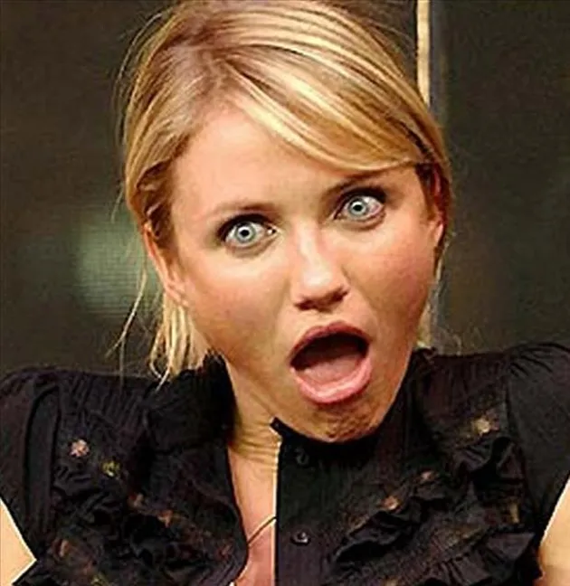 "Apa?" Cameron Diaz seperti memerankan adegan klasik dalam sinetron-sinetron di foto ini. Tahu kan? Yang pakai efek diperbesar itu lho!