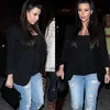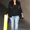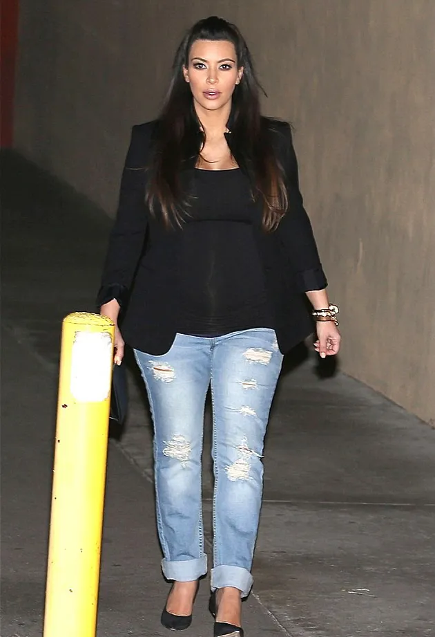 Sering terlihat dengan gaun-gaun yang cantik, kali ini Kim Kardashian tampil dengan memakai celana jeans belel. Namun karena dasarnya cantik, walau belel tetap terlihat bagus.