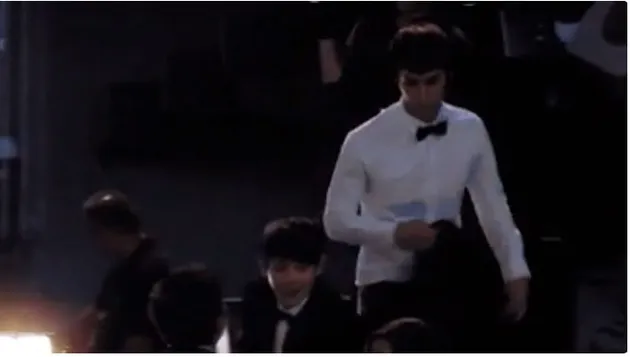 Dongwoon HIGHLIGHT terlihat melepas jas yang dikenakannya untuk diberikan pada Hayoung A Pink.