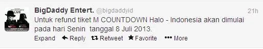 "Untuk refund tiket M! COUNTDOWN Halo - Indonesia akan dimulai pada hari Senin tanggal 8 Juli 2013," papar Big Daddy Ent seperti yang ditulis di Twitternya.Tak hanya mengumumkan soal pengembalian uang tiket, pihak Big Daddy Ent juga merilis pernyataan resmi pihak CJ E&M sebagai perwakilan Mnet perihal alasan pembatalan konser yang disebutkan akibat kondisi setempat.Dengan demikian, fans harus membuang jauh-jauh harapan untuk bisa menonton 2NE1, 2PM, MBLAQ, B2ST, Sistar, After School, Secret, Shinhwa dan lainnya dalam konser yang sedianya akan digelar pada Rabu (3/7) esok di MEIS, Jakarta Utara.
