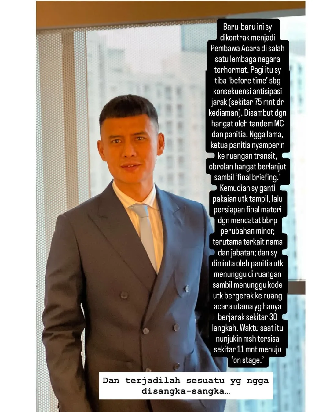 "Paginya saya tiba before time sebagai konsistensi disiplin jarak. Waktu saat itu nunjuk masih tersisa sekitar 11 menit menuju on stage," ceritanya. Namun, justru di waktu persiapan itulah insiden tak terduga terjadi.