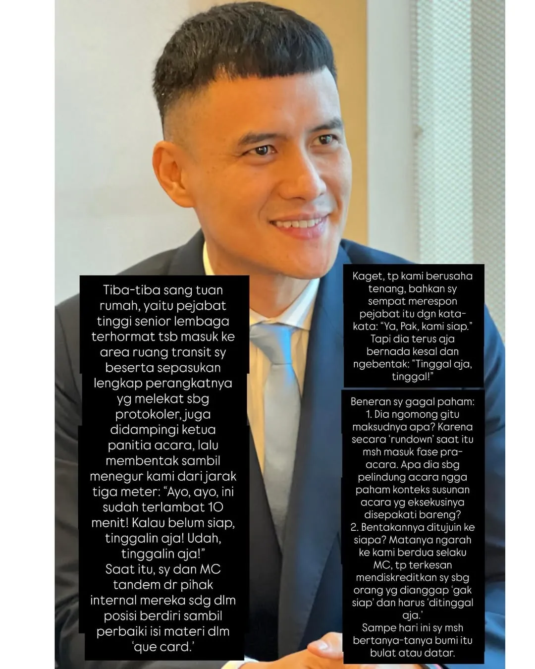 "Beneran saya gagal paham. MC itu ngomong ke rombongan? atau secara 'window shop' masih mau foto-foto? padahal acara dengan peleton pasukan paskibraka susunan acara yang eksekusinya detik-detik. Bersyukur dipimpin ke spot? Motonya ngarah ke kami berdua seolah MC. Tertawa kecil menghadapkan saya orang yang duduk (tanpa siap) dan narasumber sudah foto duduk. " jelasnya.