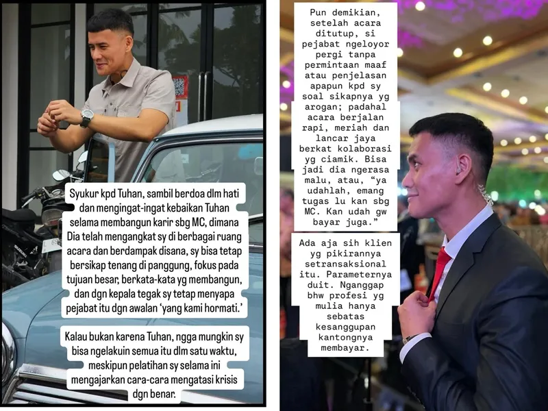 "Pengalaman buruk yang akan saya bagikan ini diajukan terutama kepada penampil panggung, terutama para MC yang berjibaku di belakang panggung sampai 'babak belur' saat tampil. Tanggapi secara tenang dan ambil hikmahnya ya." tulisnya dalam unggahan Instagram.