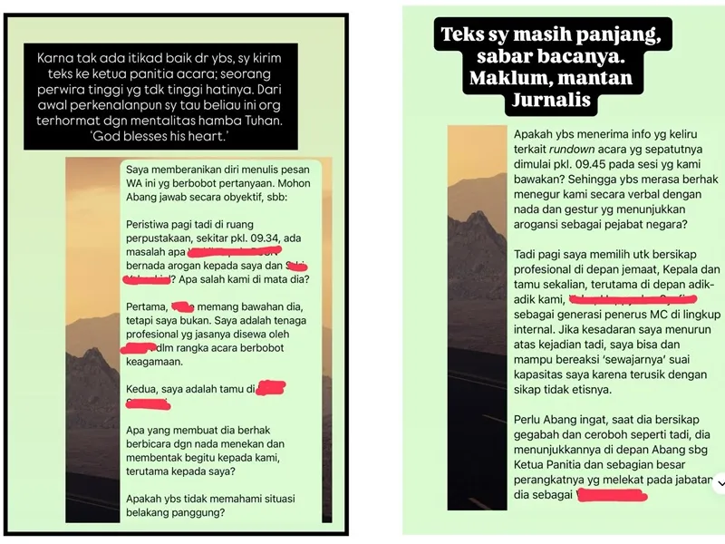 "Apa yang membuat dia berhak berbicara dengan nada menekan dan membentak begitu kepada kami, terutama kepada saya? Apakah ybs tidak memahami situasi belakang panggung?" ungkapnya