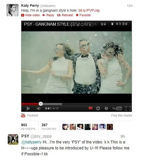 Melalui Twitter, Katy memposting, "Tolong, aku sedang berada dalam lubang Gangnam Style," seperti dilansir soompi.com. Katy juga memberikan link untuk MV PSY tersebut kepada lebih dari 25 juta followers-nya di Twitter.