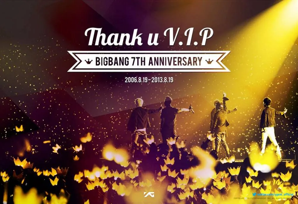 Kapanlagi.com - Memulai debut pada 19 Agustus 2006 di Gymnasctics Arena, Seoul Olympic Park saat konser ke-10 YG Family, maka pada hari Senin (19/8) ini, boyband Big Bang merayakan ulang tahun ke-7 mereka.Bisa dibilang ini termasuk hari yang spesial. Mengingat Big Bang adalah boyband K-Pop papan atas yang turut juga menjadi salah satu penggerak gelombang Hallyu Wave di dunia.Merayakan hal itu, agensi Big Bang, YG Entertainment merilis sebuah gambar istimewa yang mereka posting di Twitter. Poster itu tampak sederhana bertuliskan 'Thank U V.I.P (nama fans Big Bang)' seperti dilansir allkpop.com.