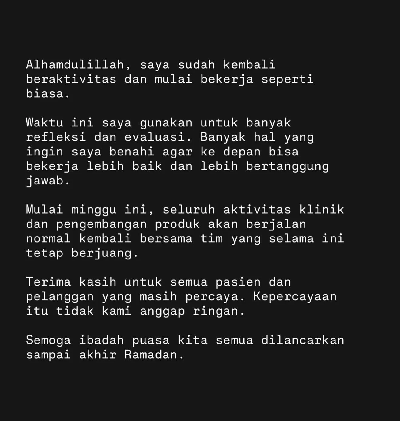 "Alhamdulillah, saya sudah kembali beraktivitas dan mulai bekerja seperti biasa. Waktu ini saya gunakan untuk banyak refleksi dan evaluasi. Banyak hal yang ingin saya benahi agar ke depan bisa bekerja lebih baik dan lebih bertanggung jawab. Mulai minggu ini, seluruh aktivitas klinik dan pengembangan produk akan berjalan normal kembali bersama tim yang selama ini tetap berjuang. Terima kasih untuk semua pasien dan pelanggan yang masih percaya. Kepercayaan itu tidak kami anggap ringan. Semoga ibadah puasa kita semua dilancarkan sampai akhir Ramadan," tulis Richard Lee di akun Instagram-nya.