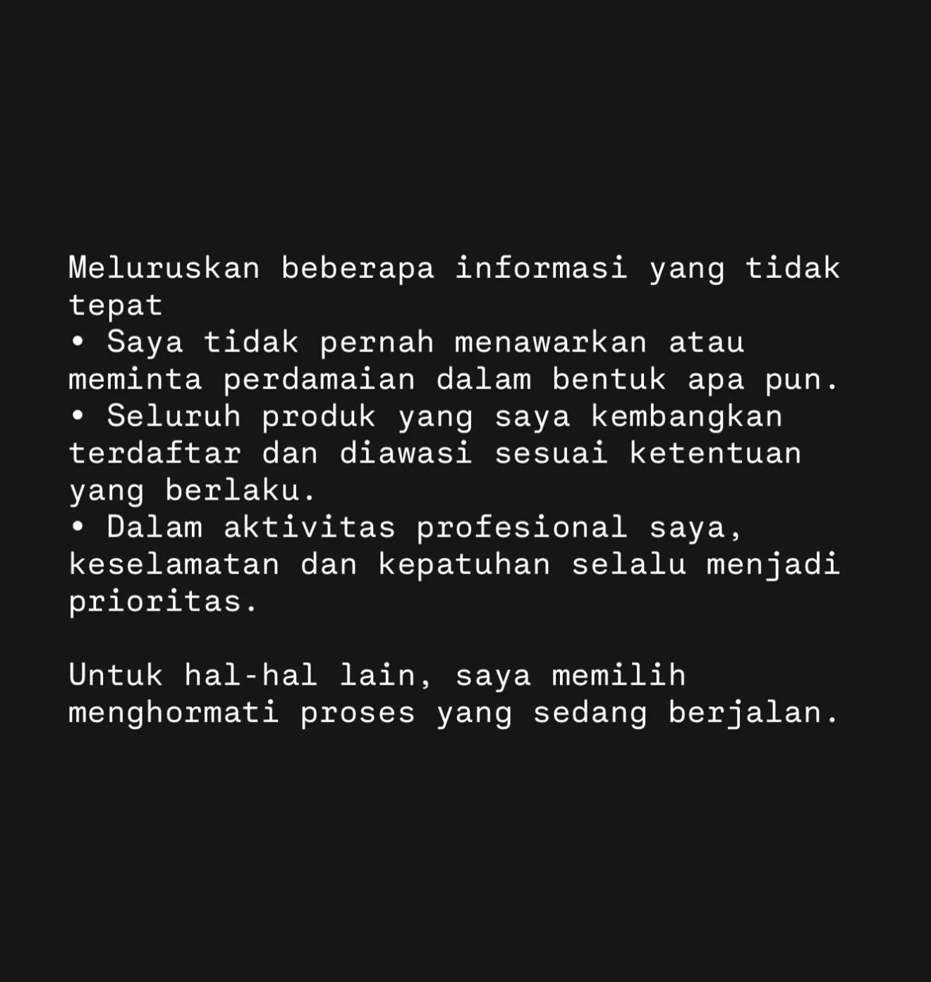 "Meluruskan beberapa informasi yang tidak tepat: Saya tidak pernah menawarkan atau meminta perdamaian dalam bentuk apa pun. Seluruh produk yang saya kembangkan terdaftar dan diawasi sesuai ketentuan yang berlaku. Dalam aktivitas profesional saya, keselamatan dan kepatuhan selalu menjadi prioritas. Untuk hal-hal lain, saya memilih menghormati proses yang sedang berjalan," tambahnya.