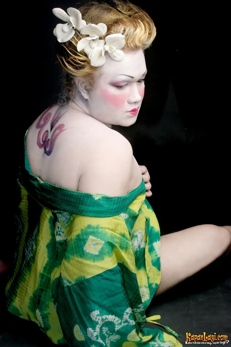 Dua kali berganti kimono, mulai dari warna hijau cerah, hingga hitam-putih. Berbagai pose ditampilkan Tata Liem dalam sesi pemotretan ala Geisha ini.