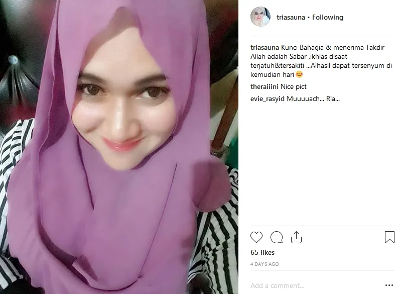 "Kunci Bahagia & menerima Takdir Allah adalah Sabar, ikhlas di saat terjatuh & tersakiti ...Alhasil dapat tersenyum di kemudian hari," tulis Ria di akun @triasauna.