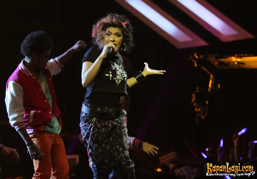 Selain nge-dance di atas panggung, Novita juga tampil dengan busana yang lebih santai dari biasanya. Ia hanya mengenakan t-shirt hitam dan celana panjang hitam dengan motif abstrak.