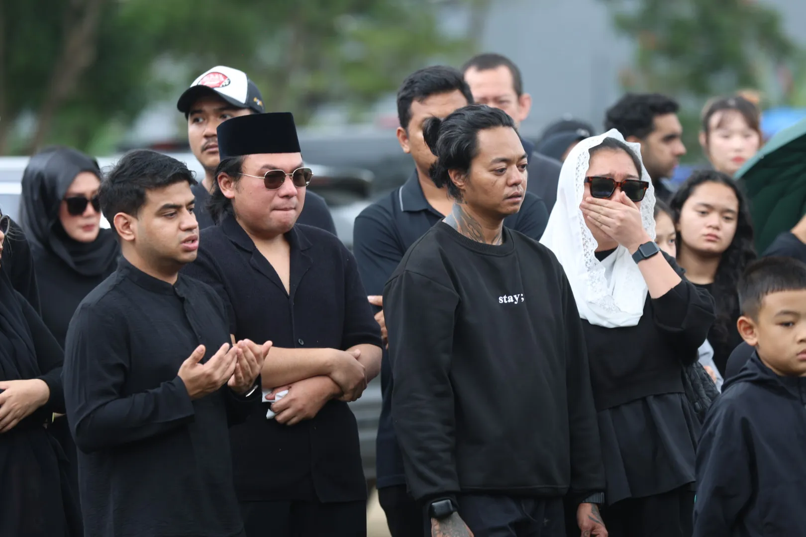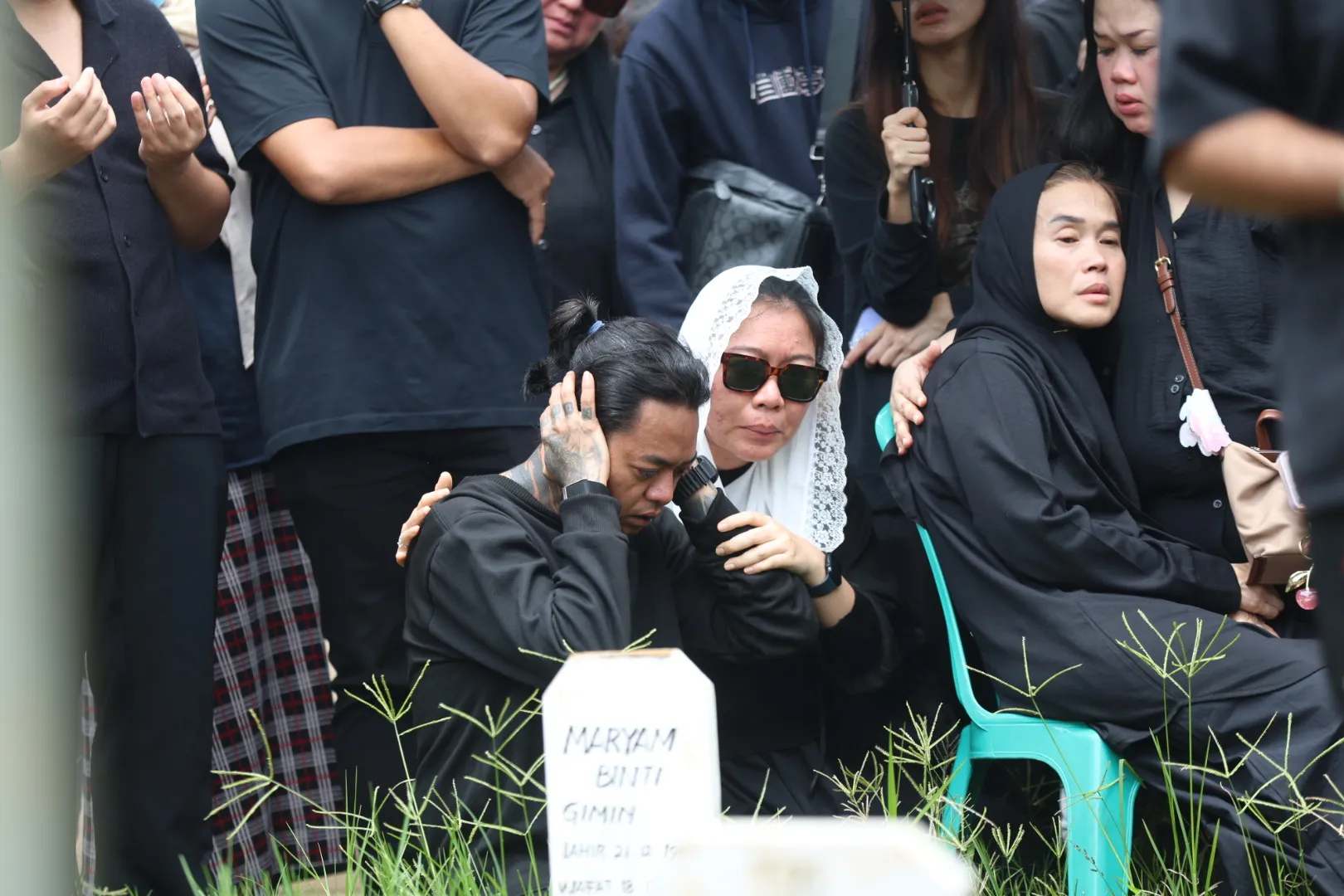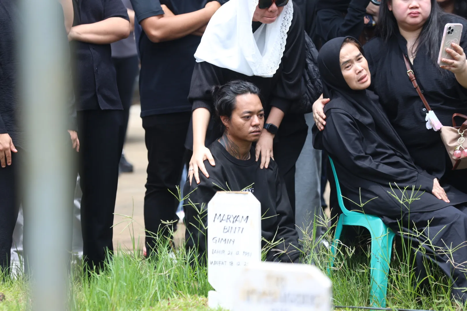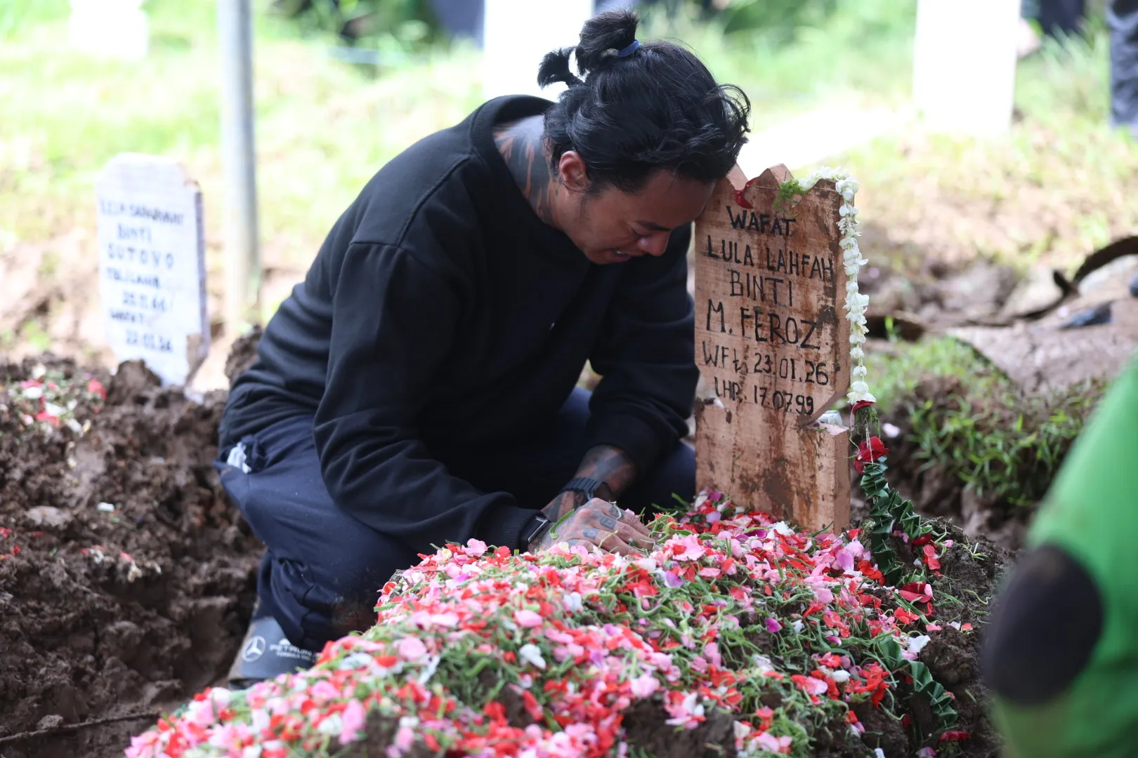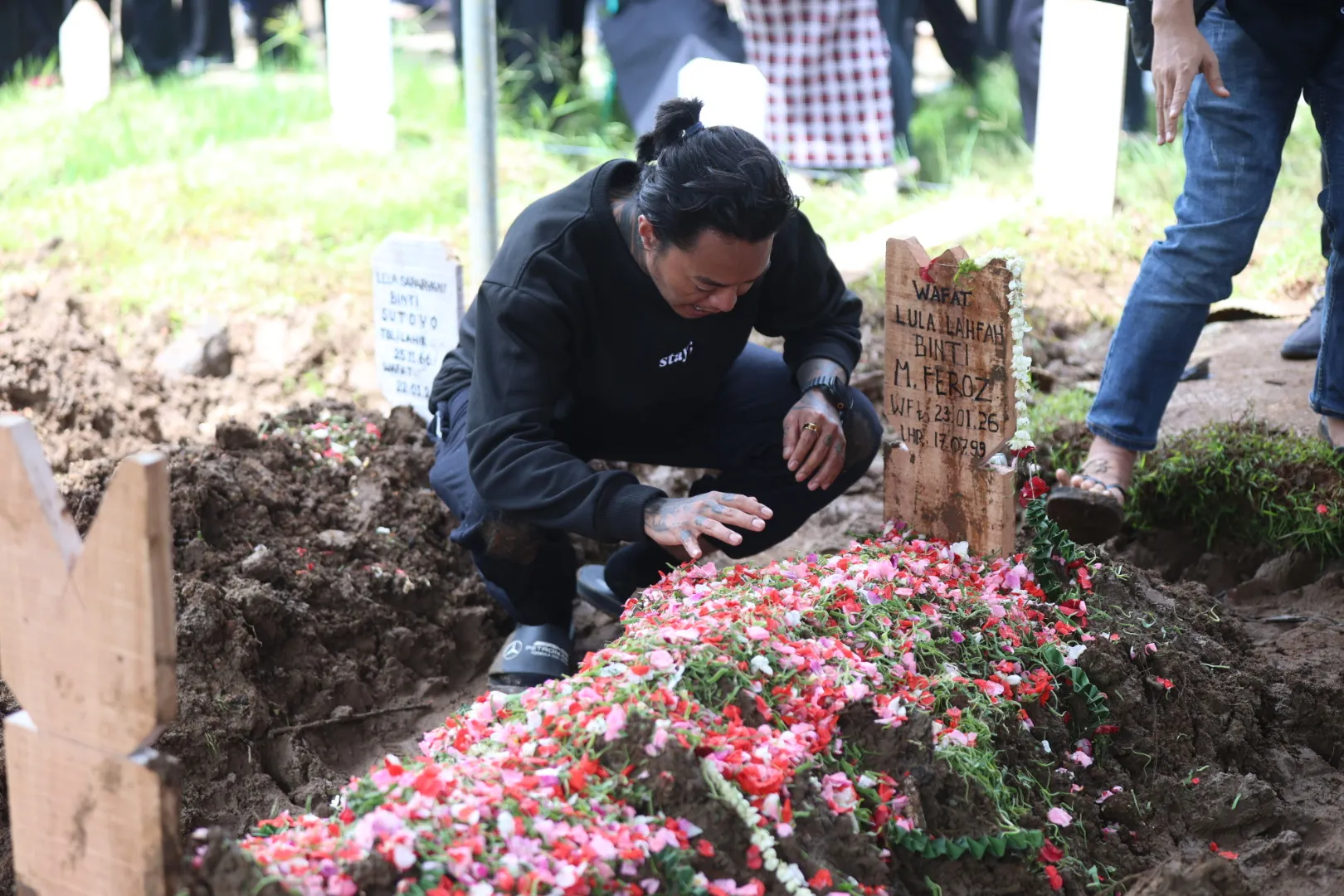 Sebelum momen histeris itu terjadi, Reza terlihat duduk termenung di dekat liang lahat. Tatapannya kosong namun penuh kesedihan saat menyaksikan tanah merah perlahan menutupi jasad wanita yang dicintainya.