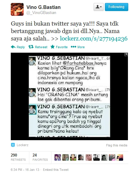 "Buat saudara2 tionghoa maupun etnis tertentu, jgn mudah terpancing dan terprovokasi dgn isu RASIS. Ada oknum yg mencoba memecah belah kita," tandas Vino.
